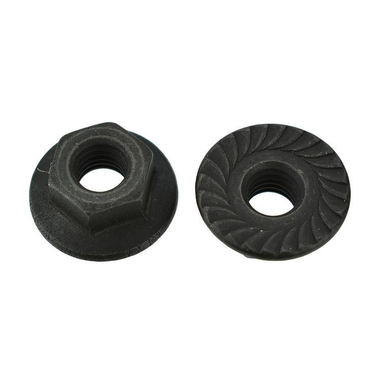 These metric hex flange nuts feature a 6-1.00mm screw thread with a built-in serrated 16mm outside diameter flange that helps resist loosening due to vibration. Each nut has a 10mm hex head and a durable black finish for corrosion resistance. Ideal for automotive assembly and general-purpose fastening where consistent torque distribution and grip are critical.